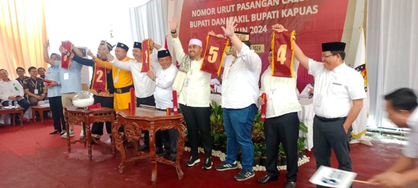 KUALA KAPUAS, teladankalimantan.com – Bertempat dihalaman kantor KPU Kapuas, KPU selenggarakan Tahapan Pemilukada Pengundian dan Pencabutan Nomor Urut masing-masing Calon peserta Pemilihan Bupati/Wakil Bupati Kapuas 2024.