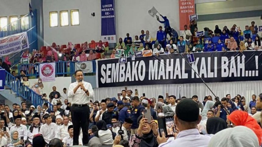 Kepada pendukungnya, Anies menanyakan apakah saat ini harga pangan murah atau lapangan pekerjaan mudah. Para pendukungnya bersahutan mengiyakan pernyataan Anies tersebut.