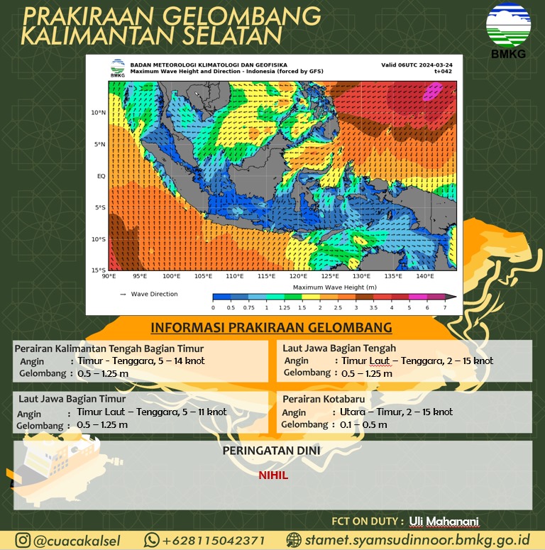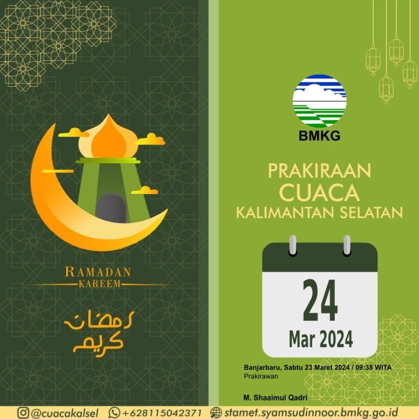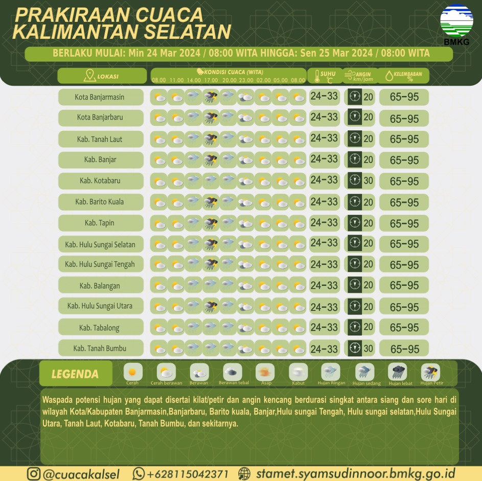 Badan Meteorologi Klimatologi dan Geofisika Kalimantan Selatan (BMKG Kalsel) memberikan peringatan dini cuaca di Kalsel, Minggu (24/03/2024), berpotensi terjadi hujan sedang hingga lebat dapat disertai kilat/petir dan angin kencang pada pukul 12:55 Wita di enam kabupaten diantaranya:
