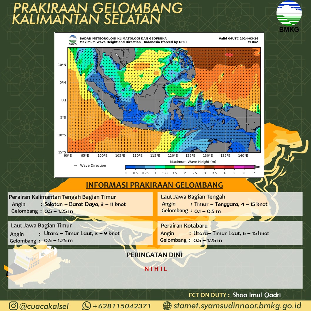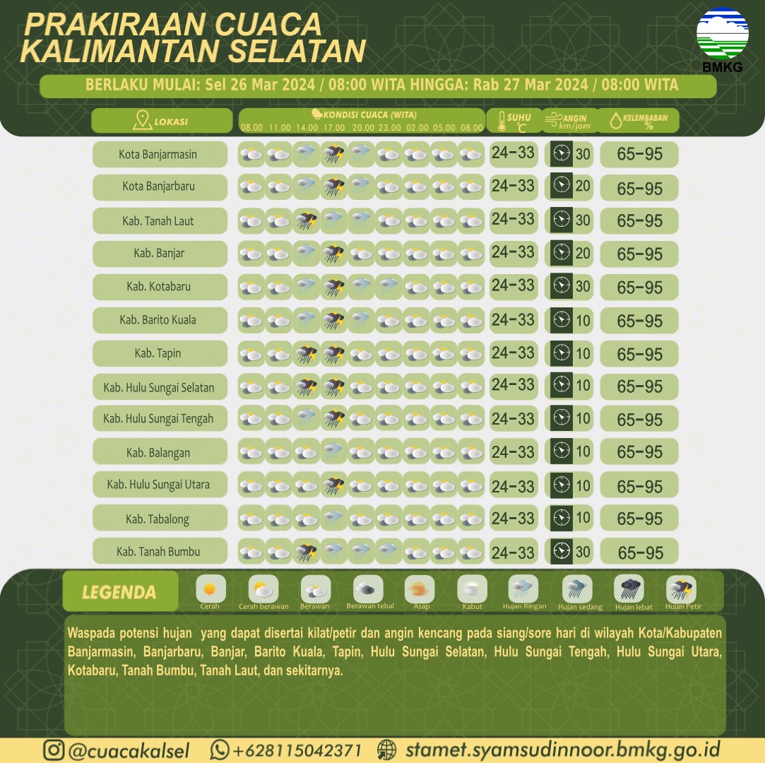 BANJARBARU,teladankalimantan.com-Badan Meteorologi Klimatologi dan Geofisika Kalimantan Selatan (BMKG Kalsel) memperingatkan dini cuaca di Kalsel, Selasa (26/03/2024), berpotensi terjadi hujan sedang hingga lebat disertai kilat/petir dan angin kencang pada pukul 15:50 Wita di 11 kabupaten/kota di Kalsel diantaranya: