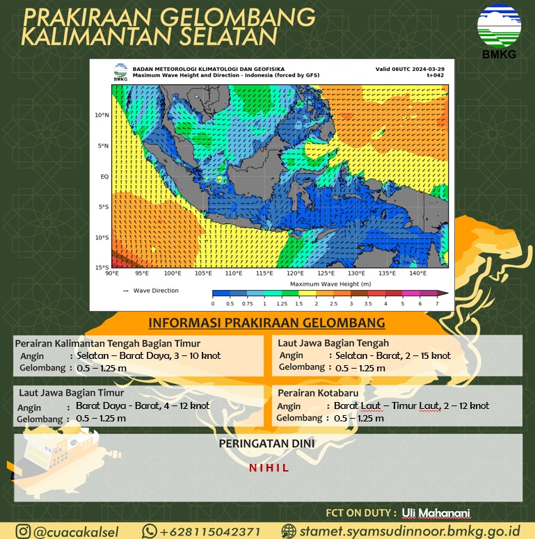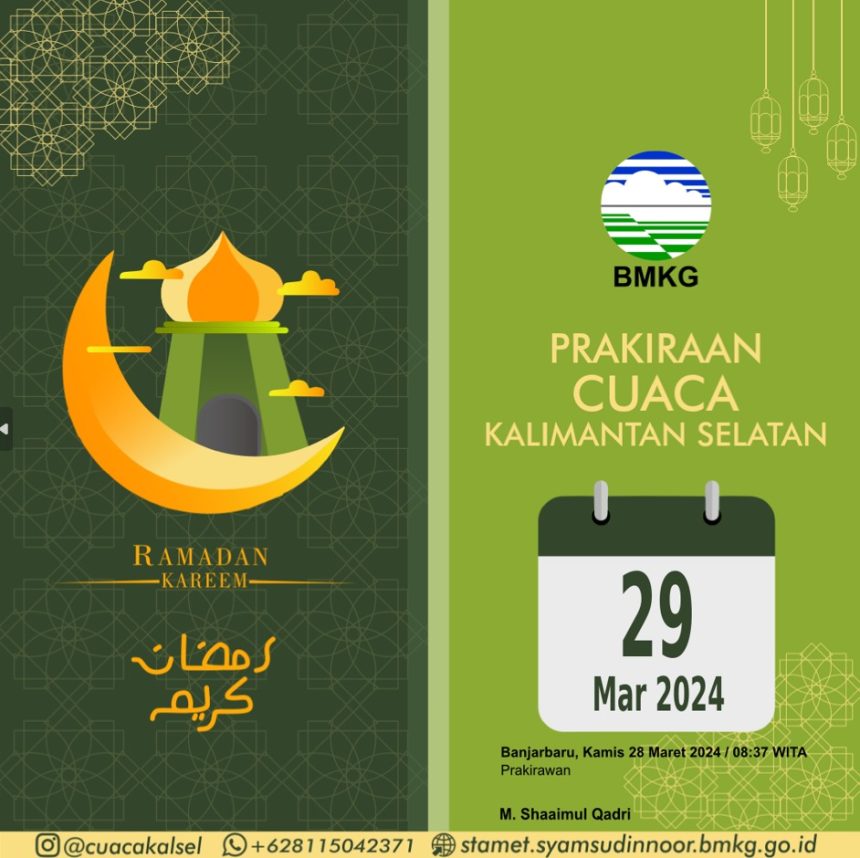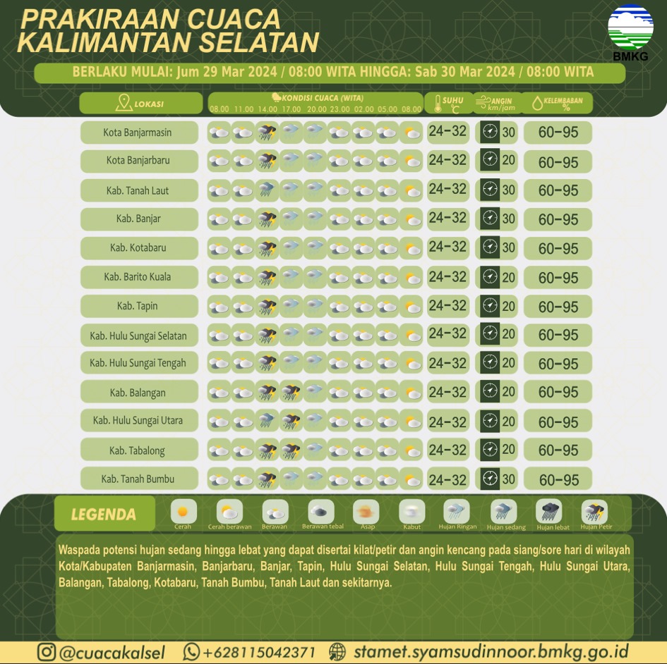 Badan Meteorologi Klimatologi dan Geofisika Kalimantan Selatan (GMKG Kalsel) memberikan peringatan dini cuaca di Kalsel, Jum’at (29/03/2024) pukul 13:35 Wita masih berpotensi terjadi hujan sedang hinhga lebat disertai kilat/petir dan angin kencang di enam kabupaten di Kalsel yakni :