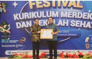 BANJARBARU,teladankalimantan.com-Kementerian Pendidikan Kebudayaan Riset dan Teknologi melalui Balai Penjamin Mutu Pendidikan Provinsi Kalimantan Selatan (BPMP Kalsel) memberikan penghargaan kepada Wali Kota Banjarbaru HM Aditya Mufti Ariffin, Pada Festival Kurikulum Merdeka dan Sekolah Sehat, di Aula BPMP Provisi Kalsel, Rabu (01/05/2024) siang.
