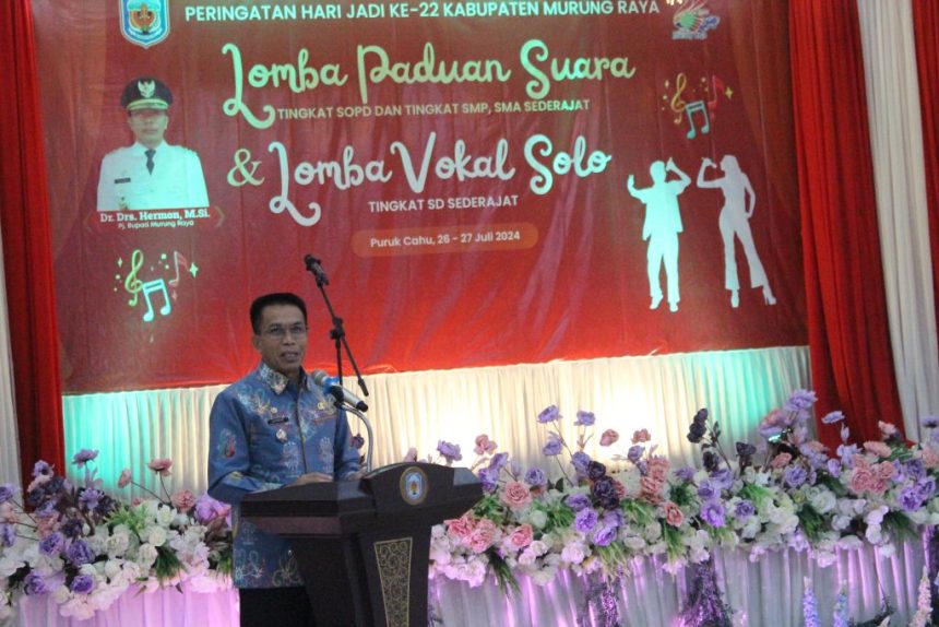 Puruk Cahu, teladankalimantan.com– Guna untuk memeriahkan Hari Jadi ke-22 Kabupaten Murung Raya, Pemerintah Kabupaten (Pemkab) Murung Raya (Mura) menyelenggarakan lomba Paduan Suara tingkat Perangkat Daerah dan tingkat SMP, SMA Sederajat, serta Lomba Vokal Solo Tingkat SD Sederajat. Lomba resmi dibuka oleh Pj Bupati Mura, Hermon dan dihadiri Pj Sekda Mura Rudie Roy unsur Forkopimda serta tamu undangan lainnya, di Gedung Pertemuan Umum (GPU) Tira Tangka Balang, Jumat (26/7/2024).
