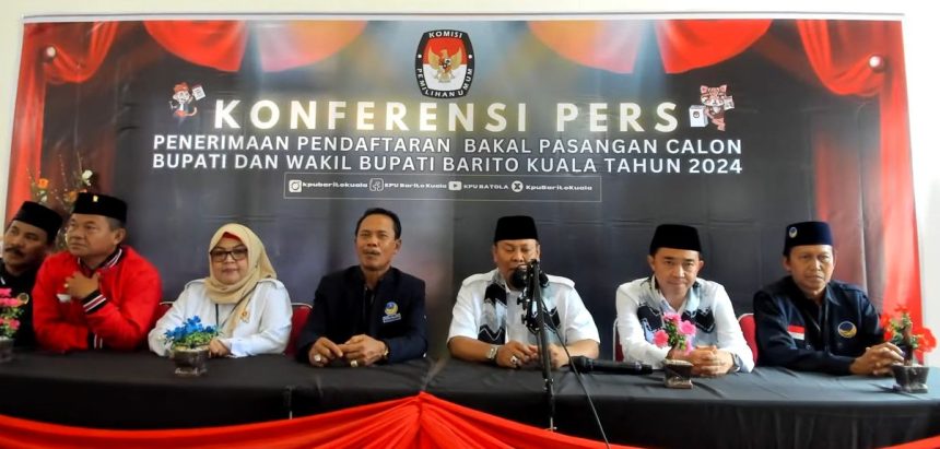 Kedua pasangan bakal calon Bupati Barito Kuala dan bakal calon Wakil Bupati Barito Kuala dipimpin H Jahrian sesampai di KPU Batola disambut Ketua KPU Batola, Rusdiansyah dan jajaran komisioner.