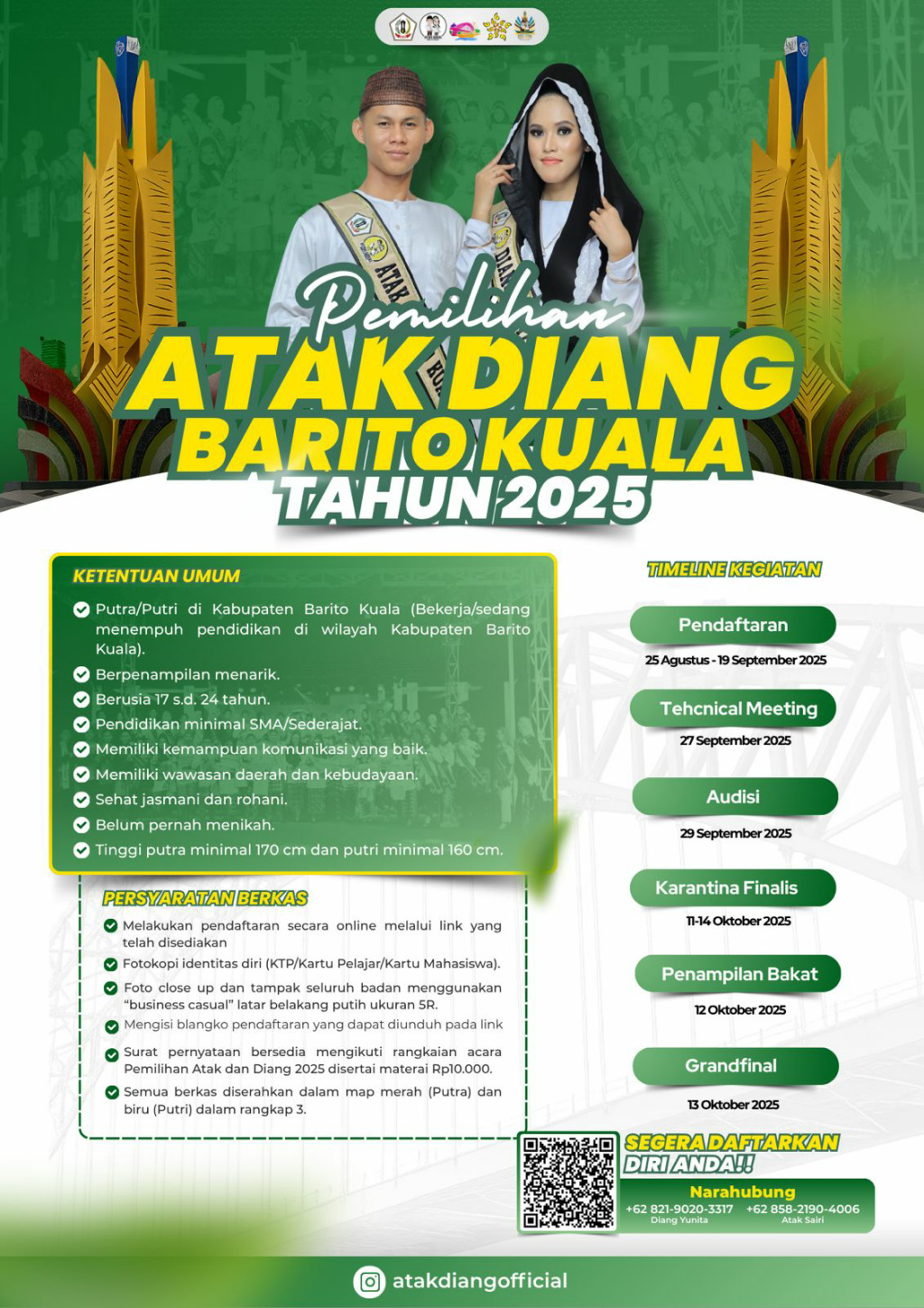 “Untuk acara grand final Atak dan Diang Batola Duta Wisata Batola 2025 akan dilaksanakan 13 Oktober 2025 malam,” terangnya.