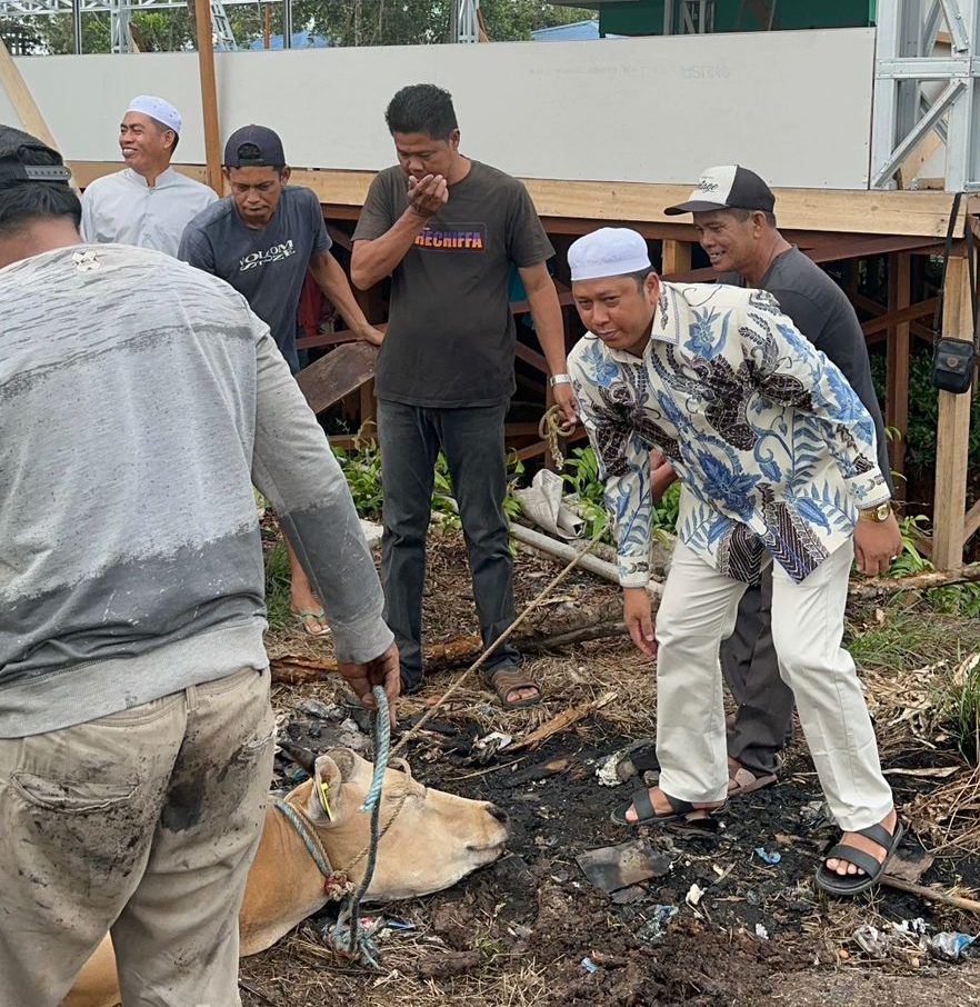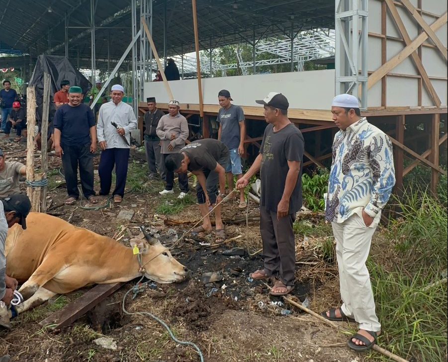 Dalam ibadah tersebut, Ustad Zulkipli memimpin pelaksanaan ibadah aqiqah sekailgus melakukan penyembelihan hewan aqiqah. Tampak H Bahrul Ilmi turut mendampingi prosesi penyembelihan hewan ibadah aqiqah tersebut.