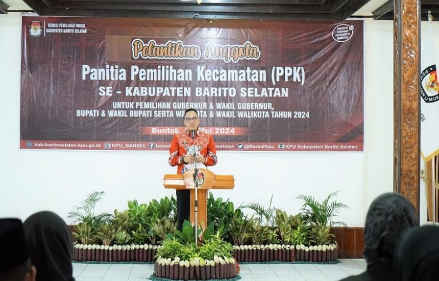 BUNTOK, teladankalimantan.com– Komisi Pemilihan Umum (KPU) Kabupaten Barito Selatan (Kab Barsel) melantik anggota Panitia Pemilihan Kecamatan (PPK) untuk pemilihan gubernur dan wakil gubernur, bupati dan wakil bupati Barito Selatan tahun 2024 di aula kantor KPU Kab Barsel, Kamis (16/5/2024)