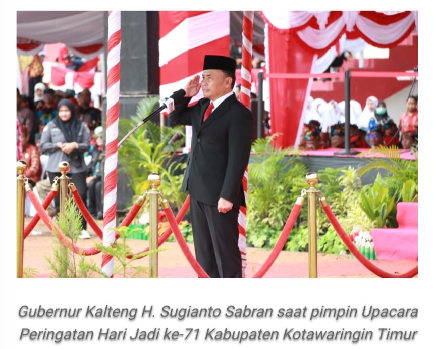 SAMPIT, teladankalimantan.com–Gubernur Kalimantan Tengah (Kalteng) Sugianto Sabran menjadi Inspektur Upacara pada Peringatan Hari Jadi Ke-71 Kabupaten Kotawaringin Timur (Kotim) di Stadion 29 November, Sampit, Minggu (7/1/2024).