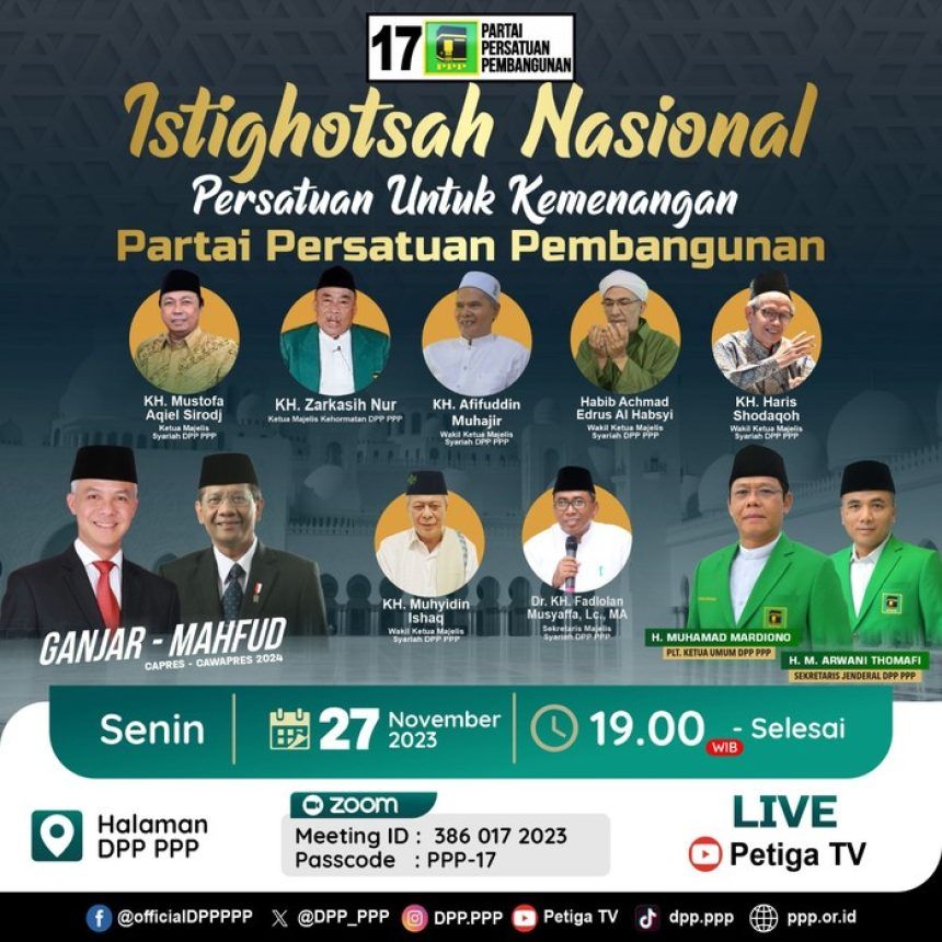 Ketua DPP PPP Bidang Infokom ini mengatakan Istigasah Nasional akan dilaksanakan pada Senin, 27 November di Halaman DPP PPP. Rencananya acara ini bakal dihadiri Ketua Majelis Syariah PPP KH Mustofa Aqiel Siroj, Ketua Majelis Kehormatan PPP KH Zarkasih Nur, Plt Ketua Umum PPP Muhamad Mardiono, Sekjen PPP Arwani Thomafi, para kyai dan habib serta calon wakil presiden Mahfud MD dan partai pengusung pasangan calon Ganjar Pranowo- Mahfud MD.