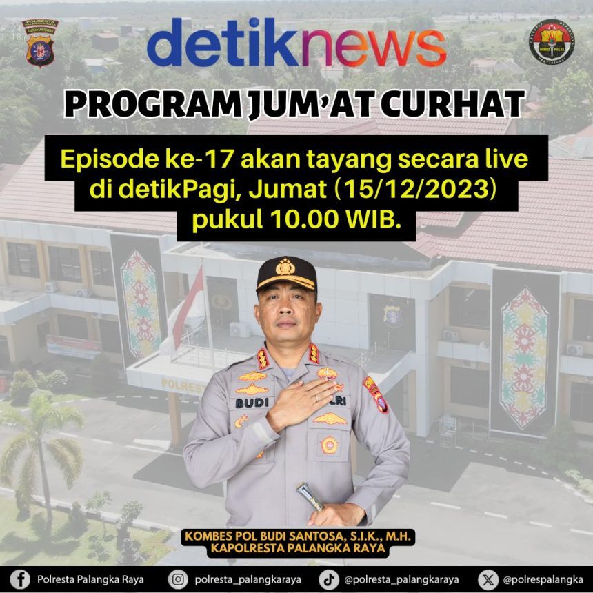 Episode ke-17 Jumat Curhat akan tayang secara live di detikPagi, Jumat (15/12/2023) pukul 10.00 WIB. Dipandu host Echo Santoso dan Sarazany, Kombes Budi akan bercerita soal kinerjanya bersama jajaran di wilayah Palangka Raya.