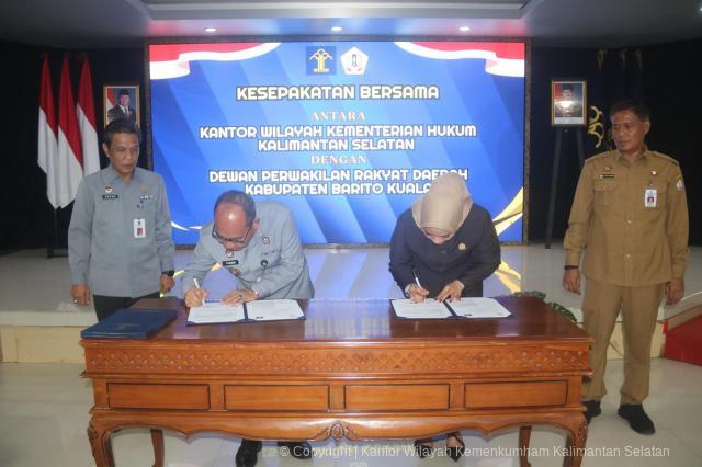 Penandatanganan itu dilakukan langsung oleh Kepala Kantor Wilayah Kemenkum Kalsel Alex Cosmas Pinem bersama Ketua DPRD Batola Ayu Dyan Liliana Sari Wiryono.