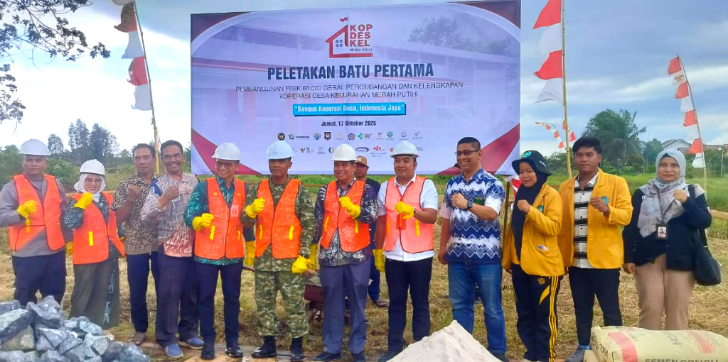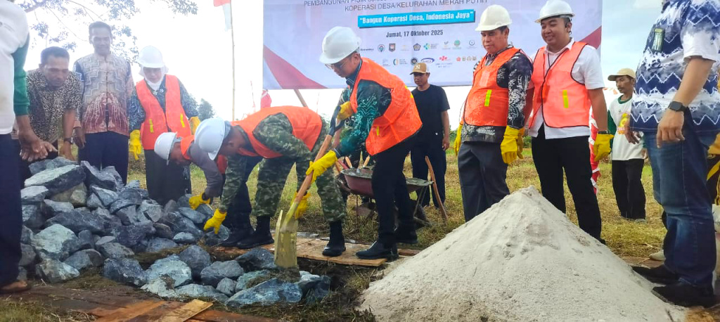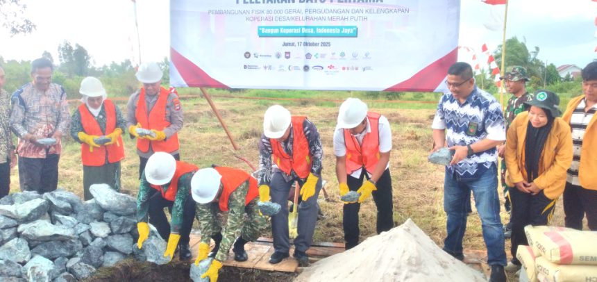Komando Distrik Militer (Kodim) 1005/ Barito Kuala bersama Dinas Koperasi dan Perdagangan Kabupaten Barito Kuala (Diskopdag Batola) melakukan Peletakan Batu Pertama (Groundbreaking) Pembangunan Fisik Gerai Pergudangan dan Kelengkapan Koperasi Desa/Kelurahan Merah Putih, di Desa Karang Bunga, Kecamatan Mandastana, Barito Kuala, Jum’at (17/10/2025).
