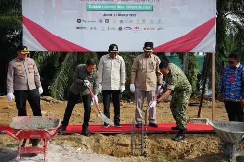 Komando Distrik Militer (Kodim) 1005/ Barito Kuala bersama Dinas Koperasi dan Perdagangan Kabupaten Barito Kuala (Diskopdag Batola) melakukan Peletakan Batu Pertama (Groundbreaking) Pembangunan Fisik Gerai Pergudangan dan Kelengkapan Koperasi Desa/Kelurahan Merah Putih, di Desa Karang Bunga, Kecamatan Mandastana, Barito Kuala, Jum’at (17/10/2025).