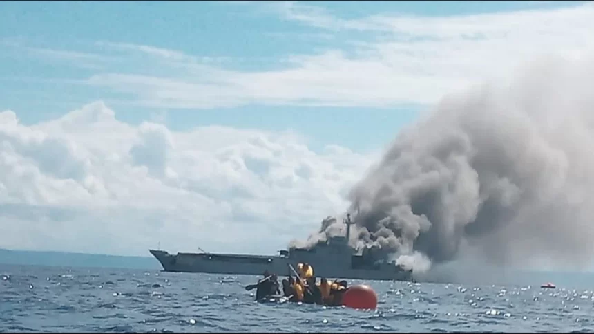 Teladankalimantan.com – Kapal Perang Republik Indonesia (KRI) Teluk Hading-538 terbakar di tengah Perairan Bira dan Pulau Selayar, Sulawesi Selatan, Sabtu siang (3/6/2023).
