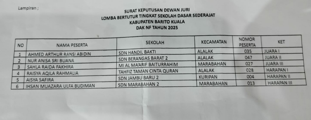 “Saya meraih juara baru pertama kali ini. Mudahan ke depan bisa mengharumkan nama Kabupaten Batola di tingkat provinsi hingga pusat,” tegasnya. (red)