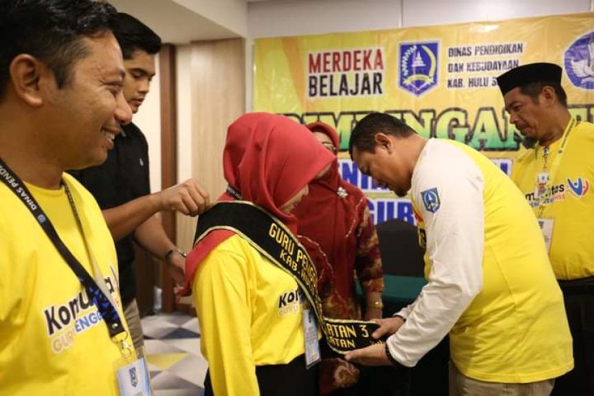 Sebelumnya Pj Bupati HSS H Hermansyah menyematkan selendang secara simbolis kepada dua orang guru penggerak Kabupaten Hulu Sungai Selatan. (ton/ist)