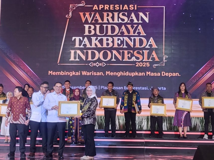 JAKARTA,Teladankalimantan.com-Pemerintah Provinsi Kalimantan Selatan (Pemprov Kalsel) meraih penghargaan bergengsi Apresiasi Warisan Budaya Tak Benda (WBTB) Indonesia dari Kementerian Kebudayaan Republik Indonesia (Kemenbud-RI) Tahun 2025. Penghargaan tersebut diserahkan langsung oleh Menteri Budaya RI Fadli Zon bersama Wakil Menteri Budaya RI Giring Ganesha Djumaryo kepada Gubernur Kalsel H Muhidin diwakili Kepala Dinas Pendidikan dan Kebudayaan (Disdikbud) Kalsel Galuh Tantri Narinda dalam acara digelar di salah satu hotel di Jakarta, Senin (15/12/2025) malam.