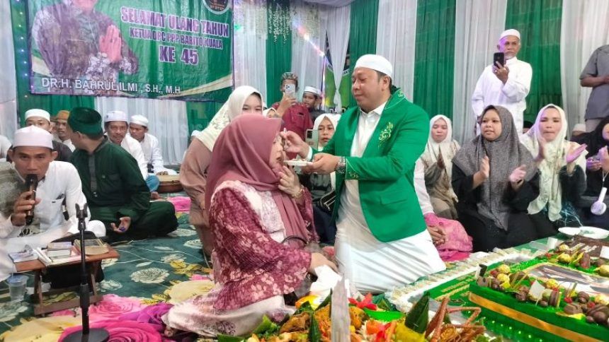 MARABAHAN, teladankalimantan.com-Majelis salawat dan pengajian rutin yang berlangsung di aula DPC PPP Batola, Handil Bakti, Alalak, Kamis malam (25/4) berbeda dari biasanya, pasalnya, para jemaah yang hadir turut menyambut kedatangan serta mendoakan, Ketua DPC PPP Barito Kuala, DR H Bahrul Ilmi yang berulang tahun ke 45.