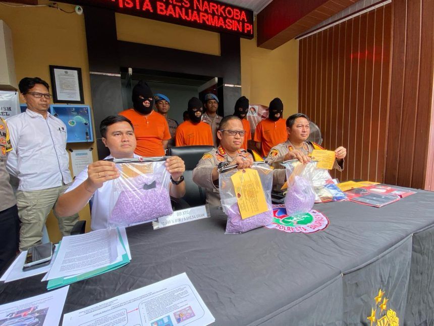 BANJARMASIN, teladankalimantan.com – Satuan Resnarkoba Kepolisian Resort Kota (Polresta) Banjarmasin mengamankan 13.697 butir ektasi berat bersih 5.592,54 gram dan sepaket serbuk warna ungu seberat 178,27 gram serta sepaket sabu seberat 0,65 gram bersama empat orang pria.