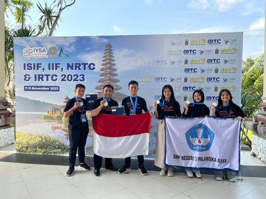 JIMBARAN, Teladankalimantan.com–Sebanyak 6 siswa atau Dua Tim SMP Negeri 3 Palangka Raya, Kalimantan Tengah berhasil membawa Dua Medali Perak mengikuti Ajang kompetisi internasional Science and Invention Fair (ISIF) tahun 2023 yang diselenggarakan oleh Indonesian Young Scientist Association (IYSA), di Auditorium Widya Sabha Kampus Universitas Udayana Jimbaran, Bali,7-9 November 2023.
