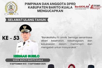 Marabahan, teladankalimantan.com – Pimpinan beserta anggota Dewan Perwakilan Rakyat Daerah Kabupaten Barito Kuala, mengucapkan : Selamat Ulang…