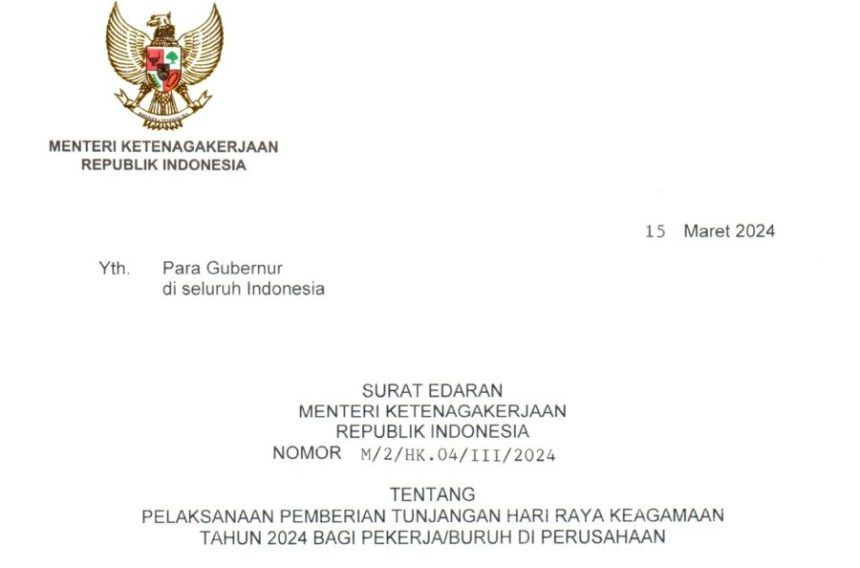 JAKARTA, teladankalimantan.com–Menteri Ketenagakerjaan (Menaker) Ida Fauziyah menerbitkan Surat Edaran (SE) Nomor M/2/HK.04/III/2024 tentang Pelaksanaan Pemberian Tunjangan Hari Raya Keagamaan 2024 Bagi Pekerja/Buruh di Perusahaan. SE yang ditandatangani Ida pada tanggal 15 Maret tersebut ditujukan kepada para gubernur di seluruh Indonesia.