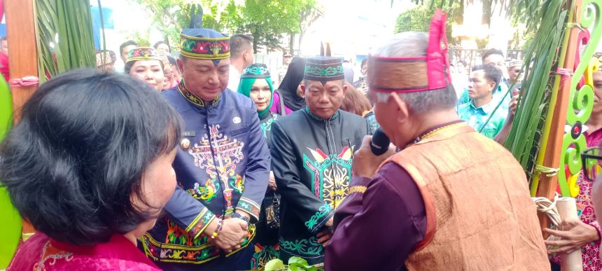 Kuala Kapuas, teladankalimantan.com – Bupati Kapuas priode 2025-2030, H. M. Wiyatno, SP, didampingi Ny. H. Siti Saniah Wiyatno bersama Wakil Bupati Dodo, SP, dan isteri ketika hendak memasuki Rumah Jabatan Bupati di sambut melalui prosesi adat Tetek Pantan dan Tampung Tawar yang dipandu oleh Damang Selat, Manli bersama Ketua Dewan Adat Dayak Kapuas, yang dilanjutkan dengan Tari Penyambutan dari kolaborasi tiga Sanggar Seni Budaya, Sanggar Seni Budaya Riak Nyalong, SSB Majar Anak Tabela SMAN-2 dan SSB SMK1 Selat. Selasa 3/3/2025.