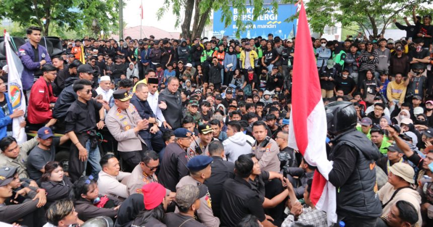 BANJARMASIN,Teladankalimantan.com-Ribuan mahasiswa Kalimantan Selatan (Kalsel) tergabung dalam Aliansi Rakyat Kalimantan Selatan Melawan menggelar aksi unjuk rasa di Dewan Perwakilan Rakyat (DPRD) Kalsel, Senin (01/09/2025).