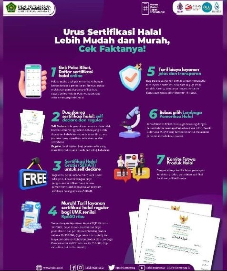 Dilansir dari laman kemenag.goid, Kepala Badan Penyelenggara Jaminan Produk Halal (BPJPH) Kementerian Agama (Kemenag) Muhammad Aqil Irham menyampaikan, saat ini mendaftar sertifikasi halal lebih mudah dan murah. Begini faktanya: