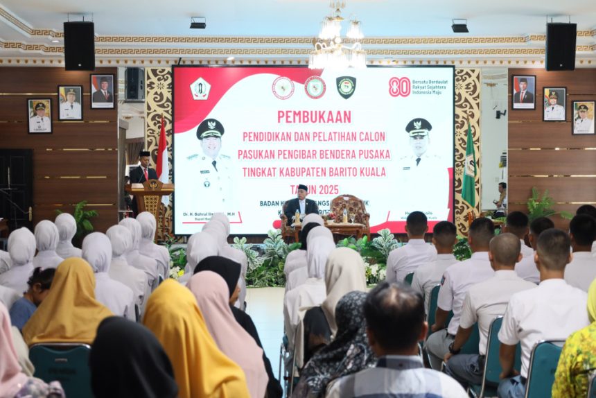 MARABAHAN,teladankalimantan.com– Wakil Bupati Barito Kuala (Wabup Batola), Herman Susilo, menghadiri sekaligus membuka secara resmi kegiatan Pemusatan Pendidikan dan Pelatihan Calon Pasukan Pengibar Bendera Pusaka (Paskibraka) dalam rangka HUT ke-80 Proklamasi Kemerdekaan Republik Indonesia (RI) Tingkat Kabupaten Batola Tahun 2025, di Aula Selidah Marabahan, Senin (28/07/2025).