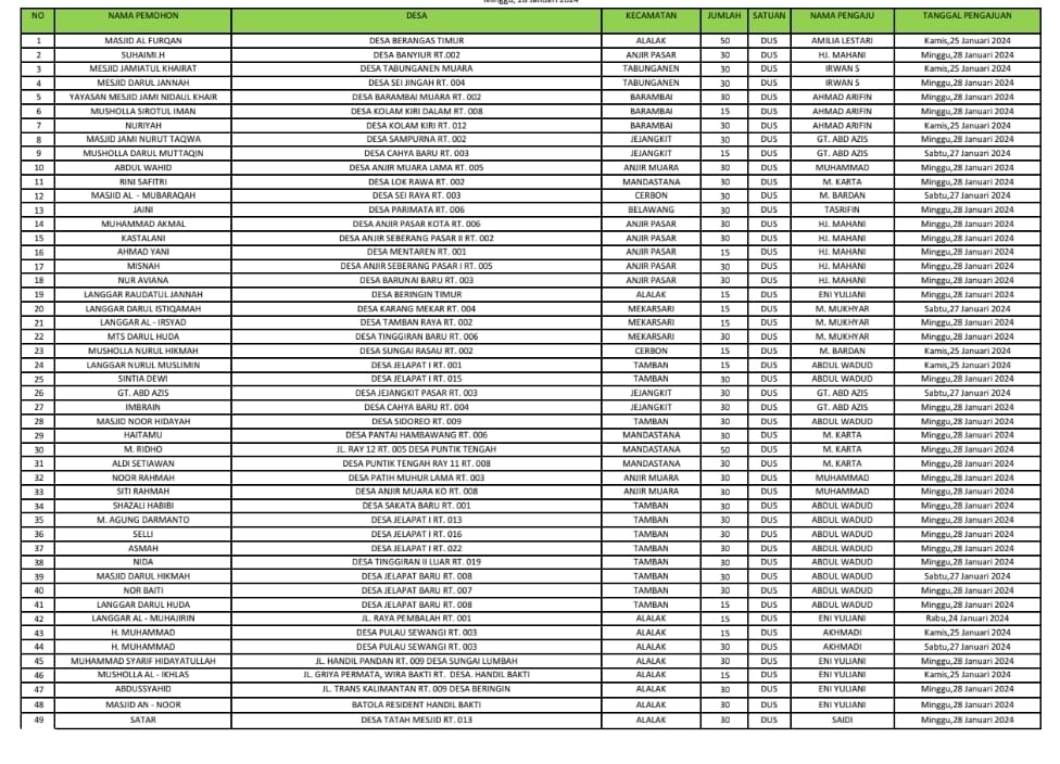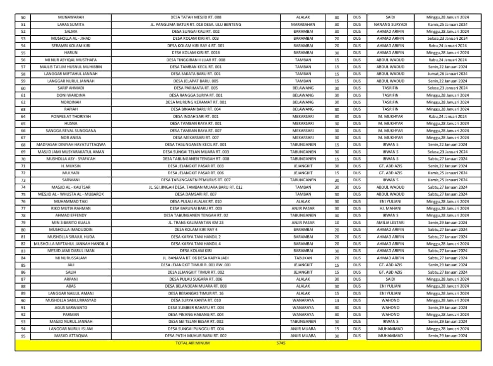 Ada sebanyak 95 titik lokasi penyaluran bantuan air mineral tersebut, dan peruntukannya bukan hanya untuk acara pernikahan maupun pada acara kematian warga saja, melainkan juga disalurkan ke masjid-masjid yang ada di wilayah Kabupaten Barito Kuala, Kalimantan Selatan.